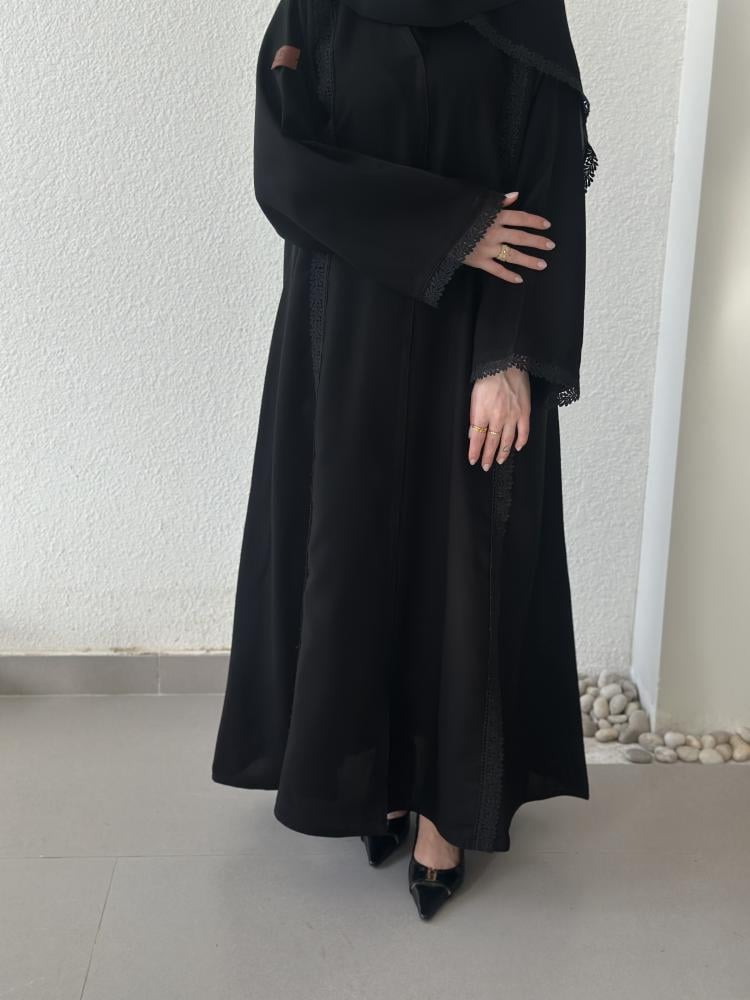 نقدم لكم عباية نص كلوش كريب تجمع بين التصميم العملي والتفاصيل الراقية، حيث يأتي الموديل بقصّة نص كلوش تمنح القماش انسيابية جذابة. مزيج كن الكلفه الدانتيل يضفي لمسة من الفخامة، بينما تعزز تدخيلات الدانتيل الدقيقة على الأكمام والجوانب من جمال التفاصيل. إضافة الطرحة البسيطة المتكاملة يجعل الإطلالة متناسقة دون الحاجة إلى إضافات أخرى.